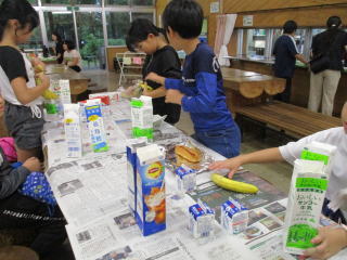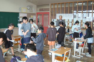 dog」と答えた子どもがいたかと思うと「one dog,one cat」「one turtle」と子どもたちが次々に発表し始めます。それに合わせたようにピーター先生の動きも大きくなり、授業が盛り上がっていく様子が伝わってきました。4年生は理科の実験キッドを担任の説明を聞いて一人ずつ作っていました。指示を聞き落とさないように、作業が遅れないように一生懸命です。3年生は習字のいろはをしっかり確認していました。