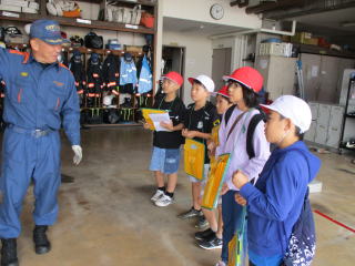 9月15日(金)に学校の避難訓練に合わせて地元消防団の方々にお越しいただき、子どもたちに放水訓練の見学や、ポンプ車の体験試乗などを実施していただきました。