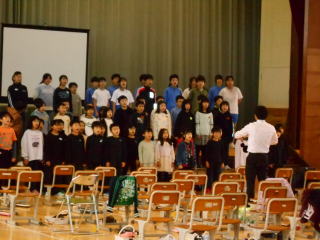 今日の3時間目は6年生を送る会でした。1年生に手を引かれた6年生の入場から始まりました。みんなでジェスチャーゲームをした後、5年生が作ったメッセージメダルを3年生が代表して6年生にかけてあげました。花のアーチは4年生が主担当。とてもきれいでした。最後に、6年生からのお礼の呼びかけと「涙そうそう」の歌のプレゼントがありました。ゲーム中はにこにこしていた子供達でしたが、真剣な表情で発表する6年生の姿をみて、胸にこみあげるものがあったようです。心温まるいい会になりました。