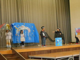 | 1年生 朗読劇「くじらぐも 大すき」 笑顔いっぱい、元気いっぱいののダンスで、お話が進行していきました。かわいさ満点です。 | 2年生 劇「スイミー」 国語の教材をもとにして、衣装もセリフも自分たちで工夫しました。長いセリフも全部暗記できていました。 | 3年生 発表「川西町のことを学んだよ」合奏「エーデルワイス・パフ」 新しいことにみんなでチャレンジ。前向きな姿勢が素晴らしいです。 |