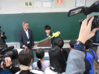 OYO応用地質株式会社の貝羽先生をお招きし、理科の出前授業をしていただきました。5年生は「流れる水のはたらき」について、川の上流と下流の違いや大塚地区の昔と今の川の流れの変容などを写真や地図を見ながら学びました。6年生は「大地のつくりと変化」について、地球の内部の構造や地震のメカニズム、大塚地区の地層の様子を見せていただいた後、地滑りや液状化現象について実験を通して学びました。どちらの学年も、教科書で学習したことが身近な大塚地区や川西町でどうなっているのかを知るとともに、災害の恐ろしさについて学ぶことができました。たくさんのマスコミが取材に入りやや緊張気味の子ども達でしたが、心に残る授業となったようです。